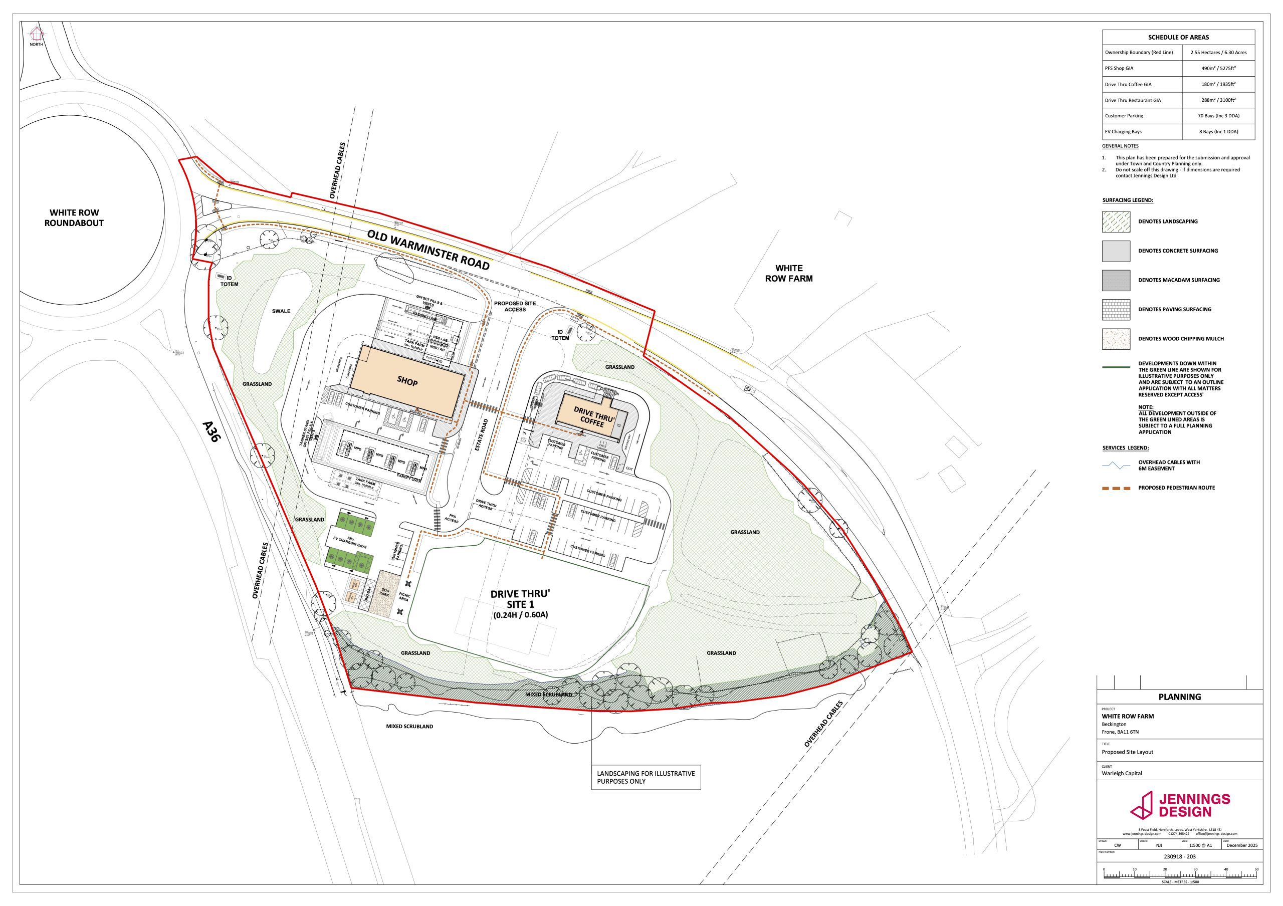 A planning application has been submitted to Somerset Council by Warleigh Capital, Spectrum Southern Ltd and White Row Country Foods Ltd. It seeks permission to develop approximately 2.55 hectares of currently undeveloped land to the south of Old Warminster Road at White Row Farm. The site is just off the A36, with access to Frome via the White Row Farm roundabout onto the A361.