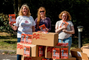 Picture: Fair Frome’s Lenka Grimes, Purple Elephant’s Sue Willis, and Hunting Raven’s Tina Gaisford-Waller, with the donation of 500 copies of Marcus Rashford’s book.