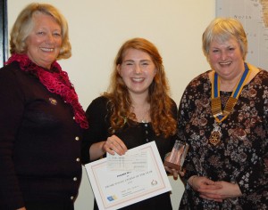 Frome Selwood Rotary Club made their annual award of the Frome Young Citizen trophy on Tuesday 21st March This award is in memory of a former club member, Eric Cretney, who was passionate about youth and about Frome and spent much of his time working for the welfare of both. The award this year was given to Phoebe Webster, a student at Frome Community College. She was presented with a cheque for £250 together with the glass obelisk Frome Young Citizen of the Year Award. Members of the Rotary Club arrange to interview candidates early in the year for the award, and a person is chosen who they feel best represents the younger generation, and who does most to benefit others in the community in their day to day lives. Some of Phoebe’s achievements involve playing the saxophone, belonging to a local musical group, taking part in Pilates classes and even helping out interviewing trainee teachers. Phoebe was accompanied by her parents Sarah and Don Webster. Dot Cretney, Phoebe Webster, and Helen Woodhead (president of Frome Selwood Rotary Club)