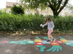 The council’s community development team has been exploring ways of being more playful in the town and has organised some permanent installations. These include a dragon hopscotch and a ‘mimic me’ spot in Victoria Park, a giant snakes and ladders at Welshmill, a trail along Weylands, and a leapfrog at the Old Showfield.