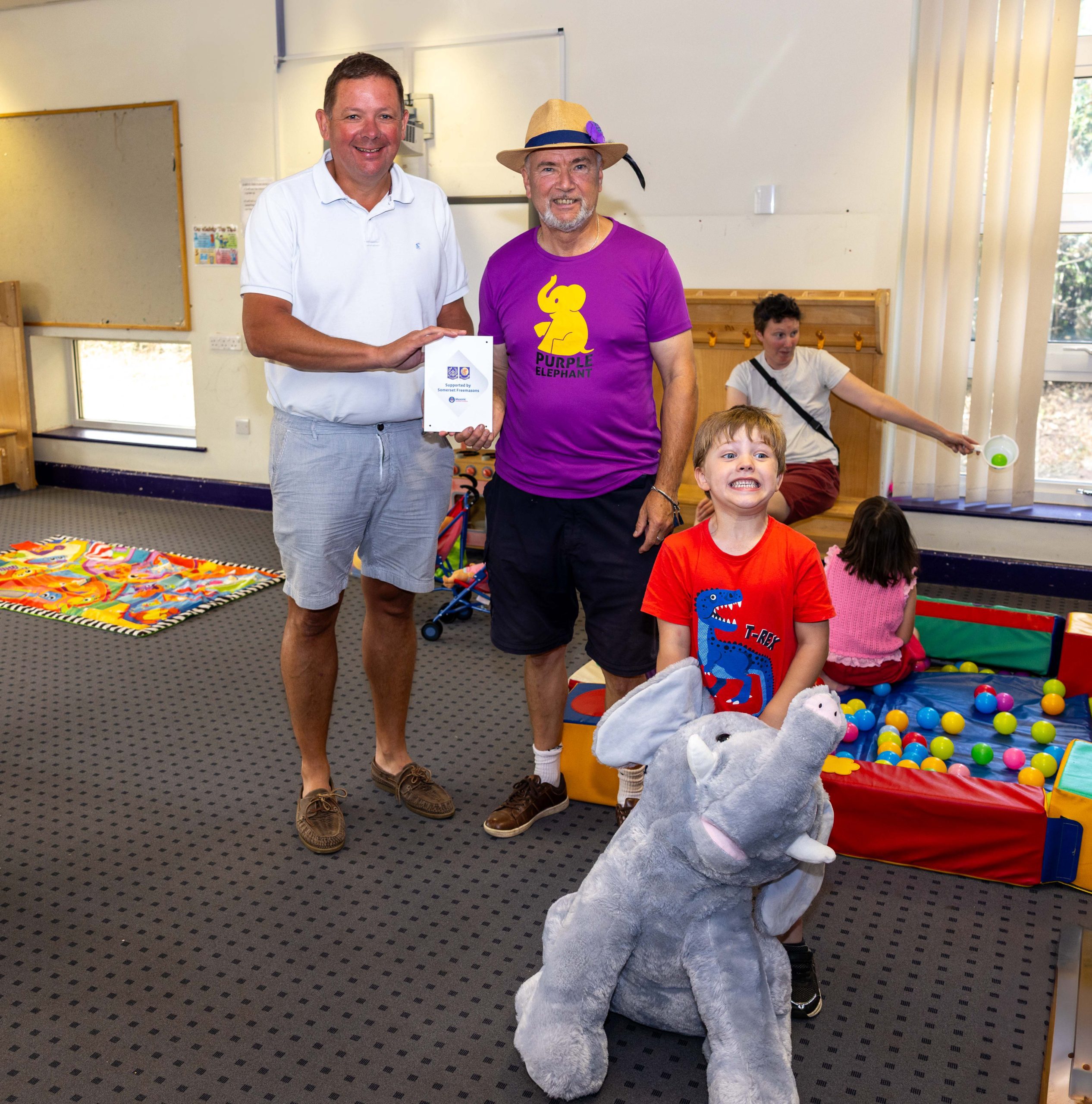 Frome Freemason Andy Baird, the Communications Officer for Somerset Freemasons and the Royal Somerset Lodge, took time out to visit one of Purple Elephant’s twice weekly ‘Stay and Play’ sessions. He was joined at The Key Centre by Graham Puddy, Adrian Robson and Les Pickersgill, Freemasons of the Province of Somerset, who said he enjoyed playing with the mini transport mat, cuddly toys and ball pit almost as much as the young families.