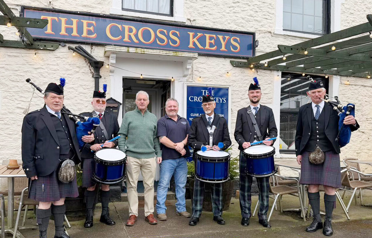 The gathering at The Cross Keys pub in Blatchbridge on 4th April was welcomed by a five-piece bagpipe and drum band.